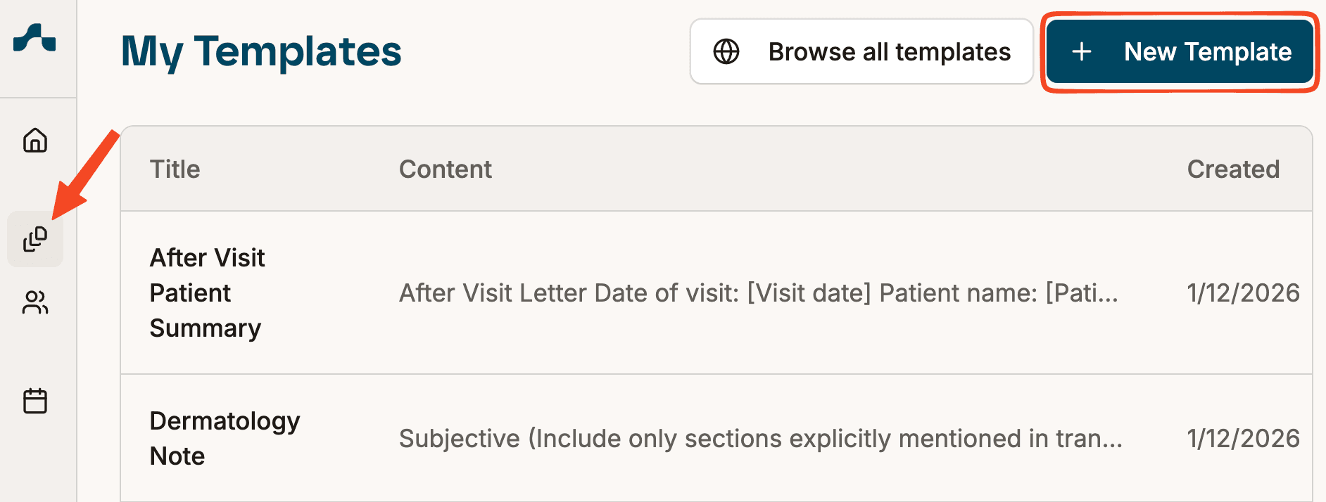 - You will see a list of your current templates (e.g., SOAP Note, Referral Letter, Family Medicine Note)